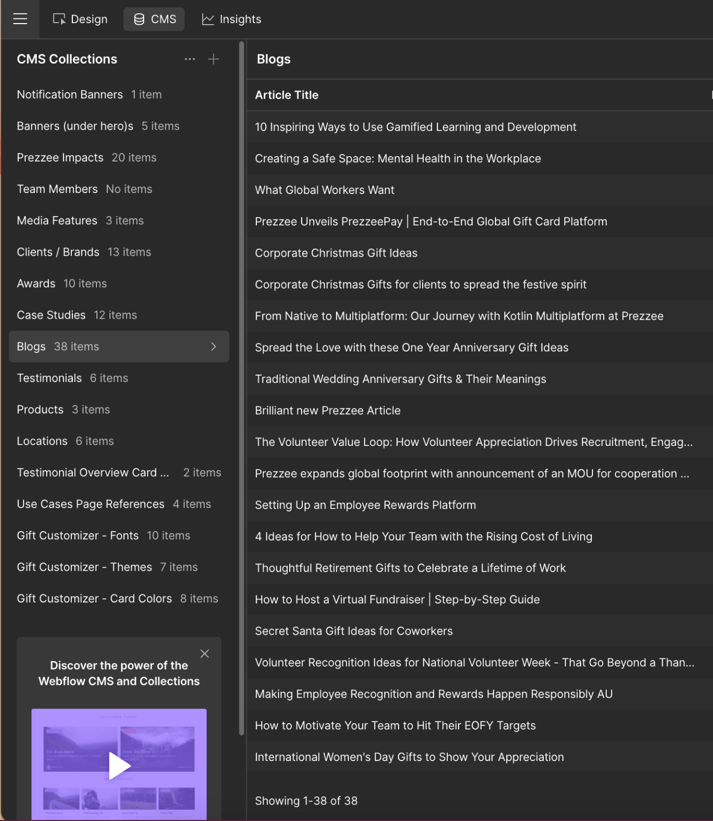 I led a full redesign of the Prezzee Business website in partnership with an external agency, which established elevated and modernised brand expression, increased content and information availability for customers, built a scalable component system, created a CMS-enabled hub for SEO and gave marketing full control within Webflow. This reset the quality and speed benchmark for all digital work within the business.