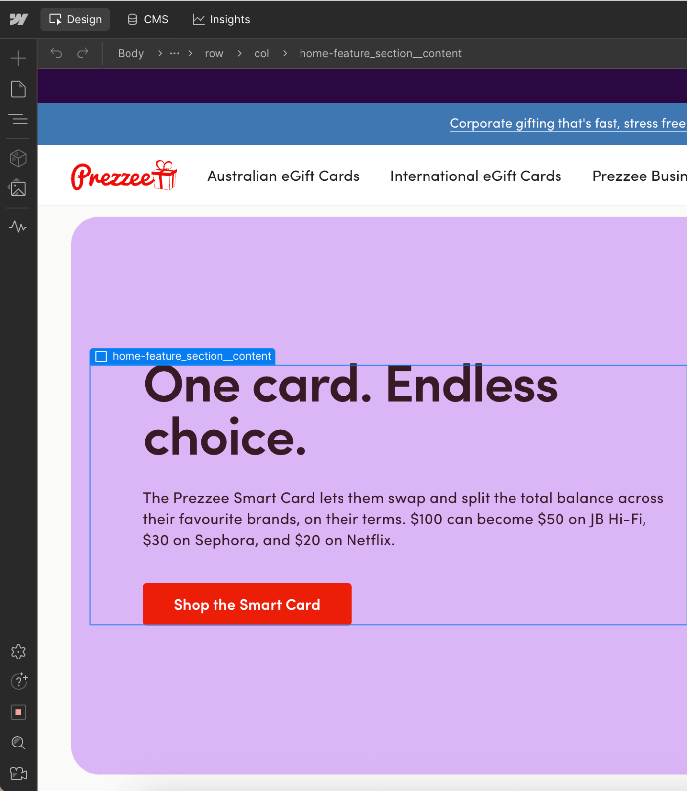 The turning point came when speed became non-negotiable. I made a deal with leadership: let me rebuild the current Prezzee Business Homepage in Webflow to meet a fixed Christmas deadline.